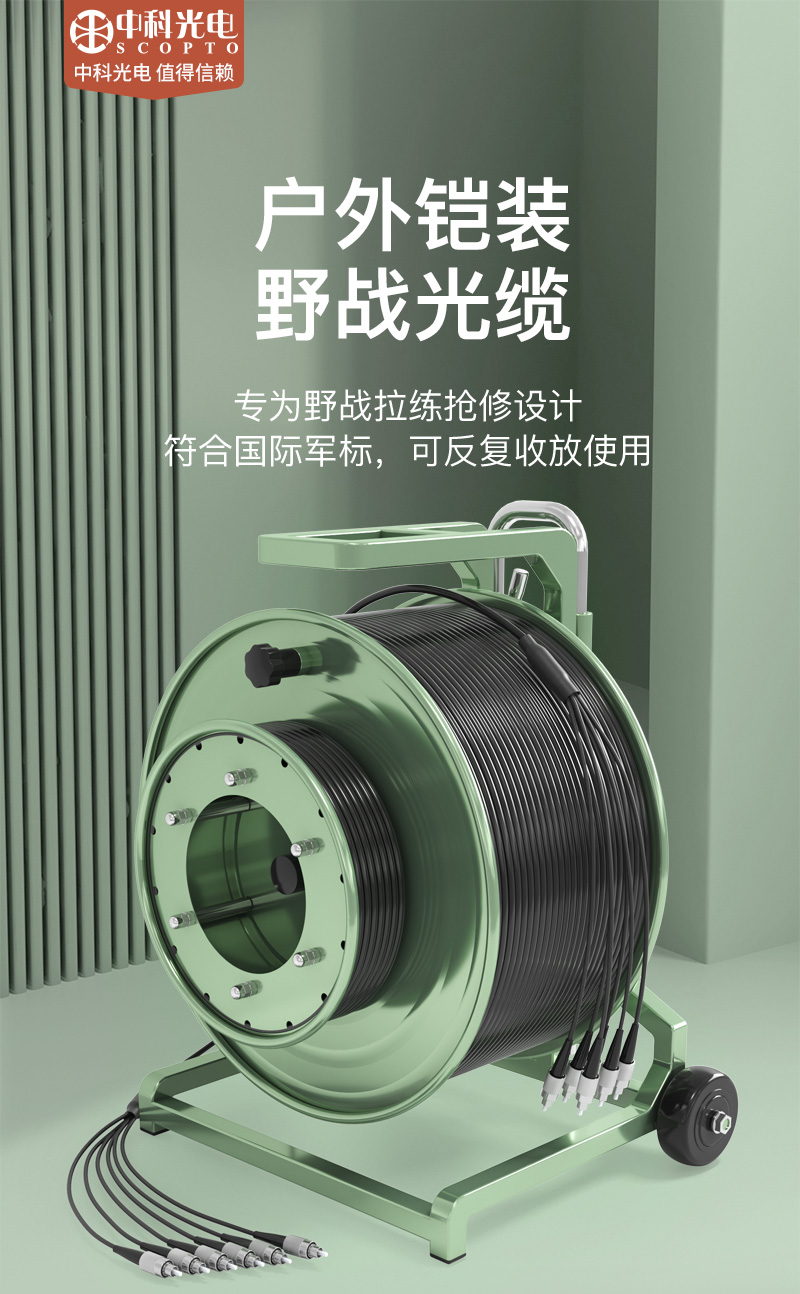中科光電 單模六芯室外TPU野戰(zhàn)光纜 鎧裝防水基站通信野外拉練搶修  1000/2000米+放纜車+FC接口