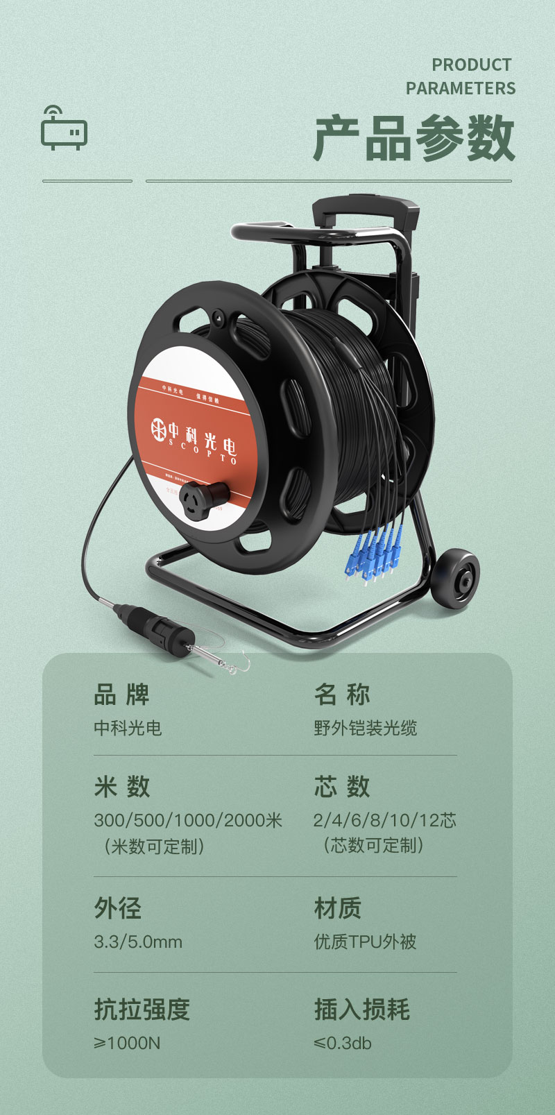 中科光電 單模八芯車壁式TPU室外野戰(zhàn)光纜鎧裝防水通信野外拉練搶修500米+放纜車+航空頭-SC頭