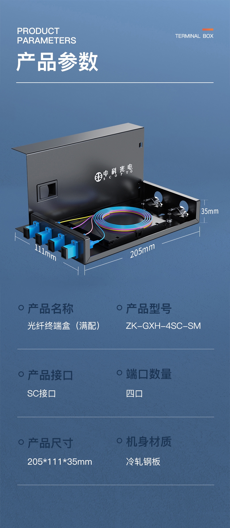 中科光電 光纖終端盒4口 4芯光纖熔接盒 光纜接續(xù)盒 接線熔纖盒 SC單模滿配尾纖法蘭 壁掛式 ZK-GXH-4SC-SM