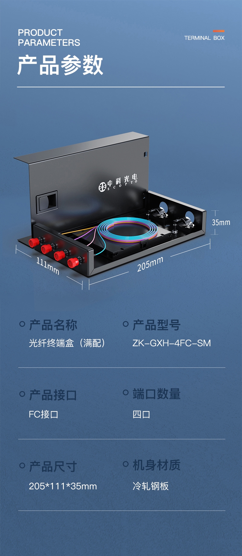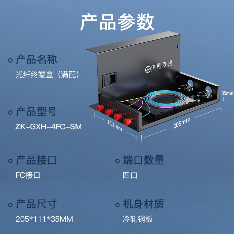 中科光電 光纖終端盒4口 4芯光纖熔接盒 光纜接續(xù)盒 接線熔纖盒 FC單模滿配尾纖法蘭 壁掛式 ZK-GXH-4FC-SM