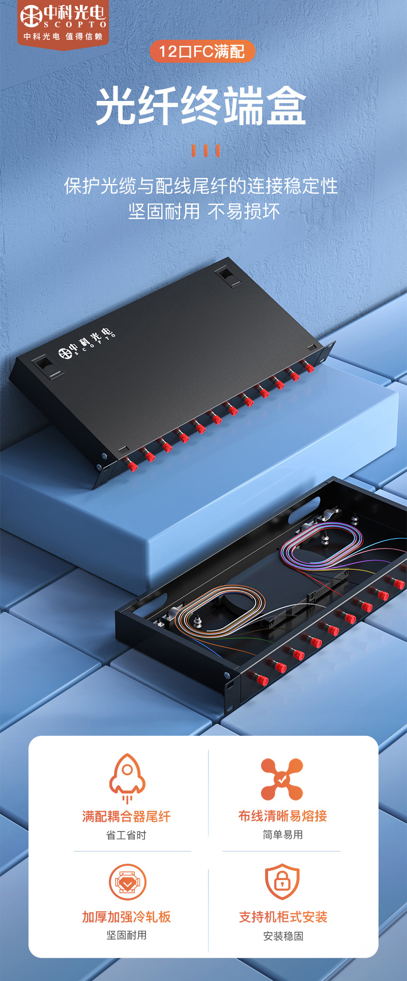 中科光電 光纖終端盒12口 12芯光纖配線(xiàn)架 光纜接續(xù)盒接線(xiàn)熔纖盒 FC單模滿(mǎn)配尾纖法蘭 機(jī)架式 ZK-GXH-12FC-SM