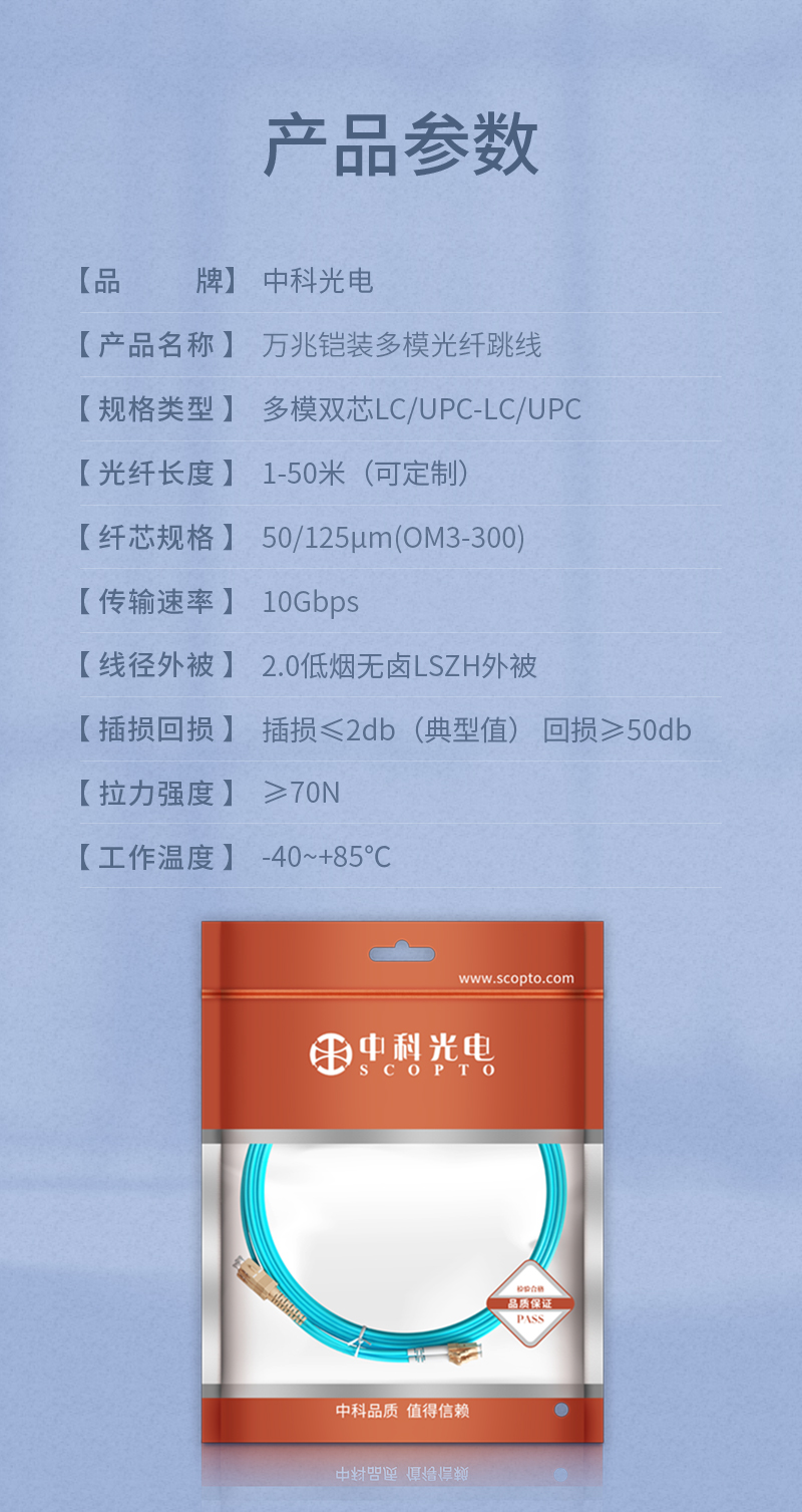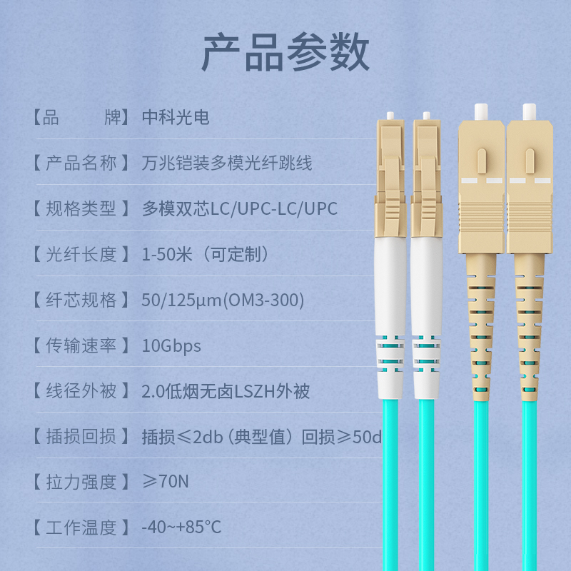 中科光電 OM3萬(wàn)兆鎧裝光纖跳線LC-SC  多模雙芯尾纖 室內(nèi)抗拉壓防鼠咬光纖線  長(zhǎng)度可定制