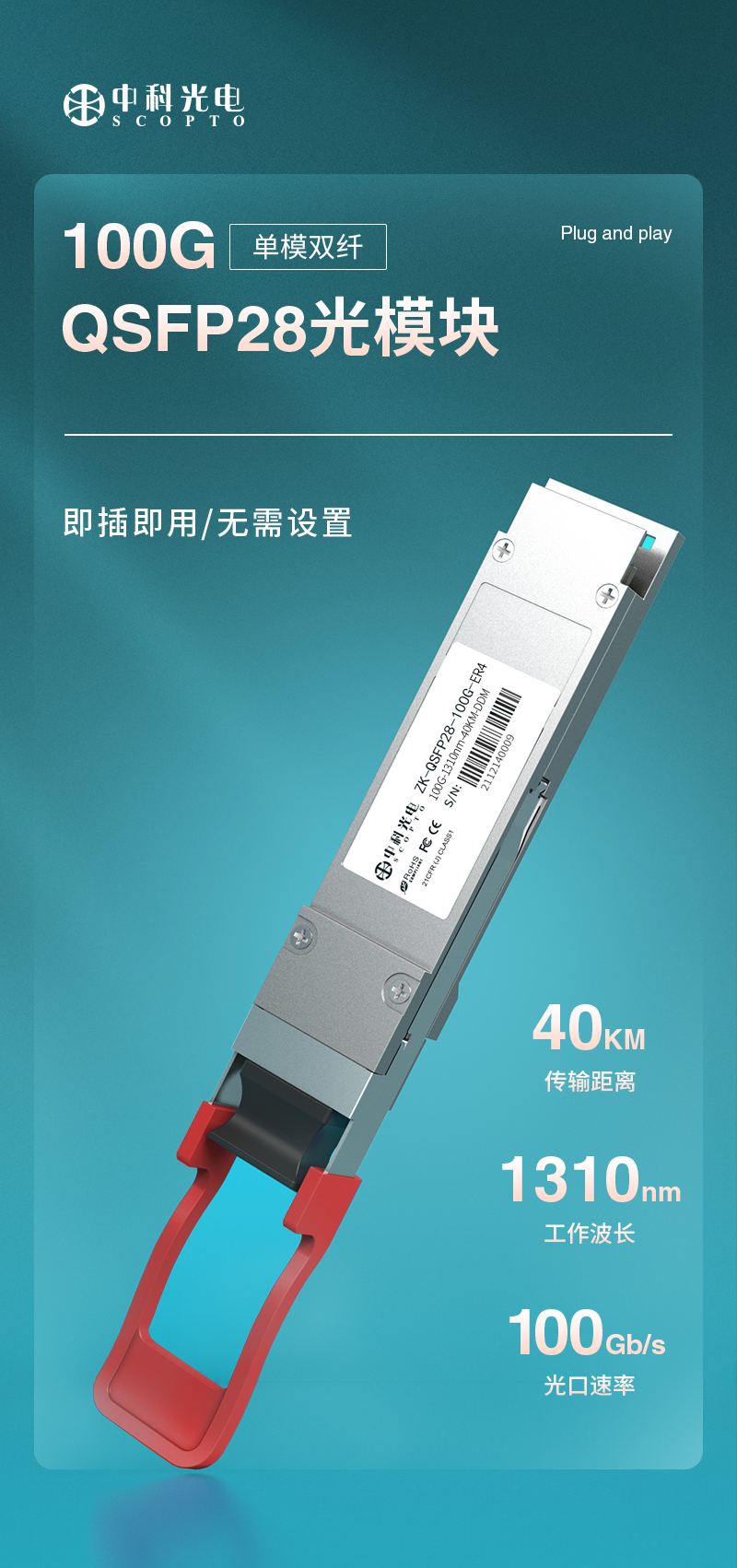 中科光電 ZK-QSFP28-100G-ER4 光模塊光纖模塊單模雙纖1310nm,40KM,LC接口適用各品牌華為華三思科銳捷交換機