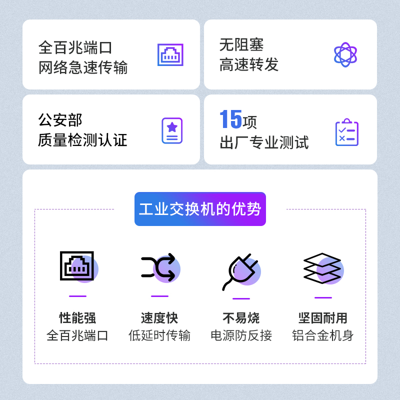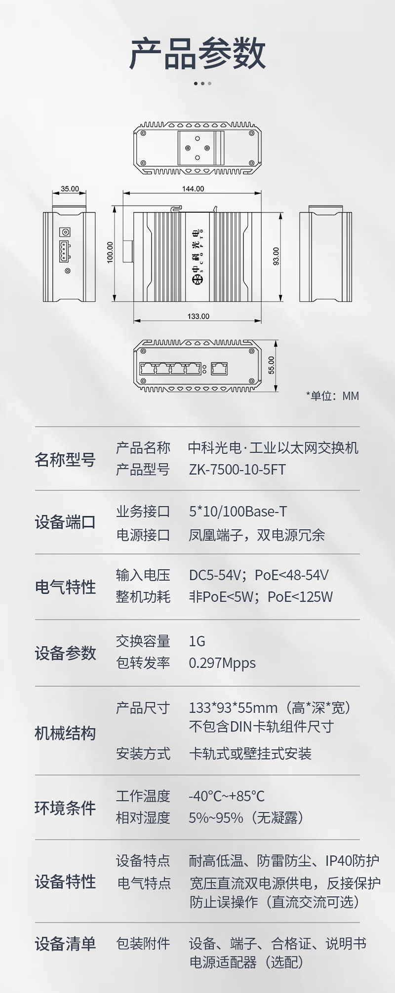 中科光電 工業(yè)級(jí)5口百兆交換機(jī) 安防監(jiān)控工業(yè)以太網(wǎng)交換機(jī) 12V/24V/48V供電導(dǎo)軌壁掛式安裝 ZK-7000-15-5FE