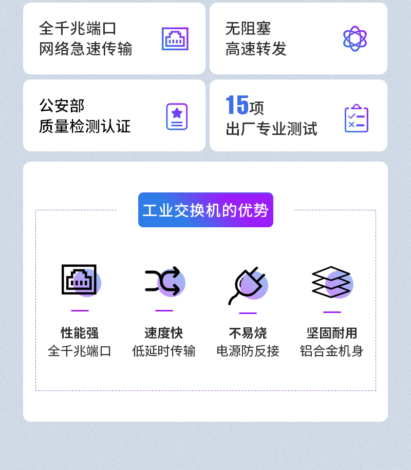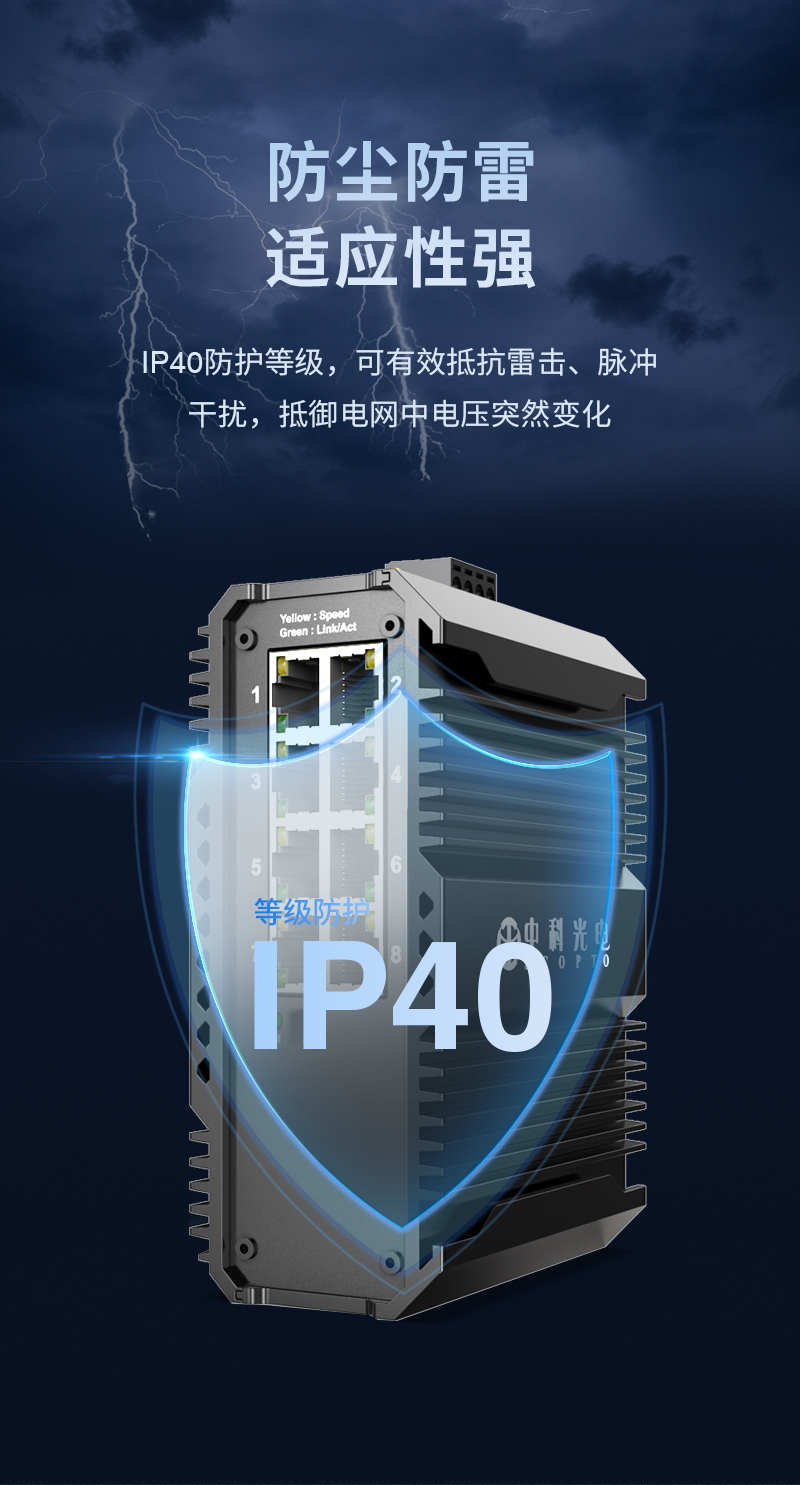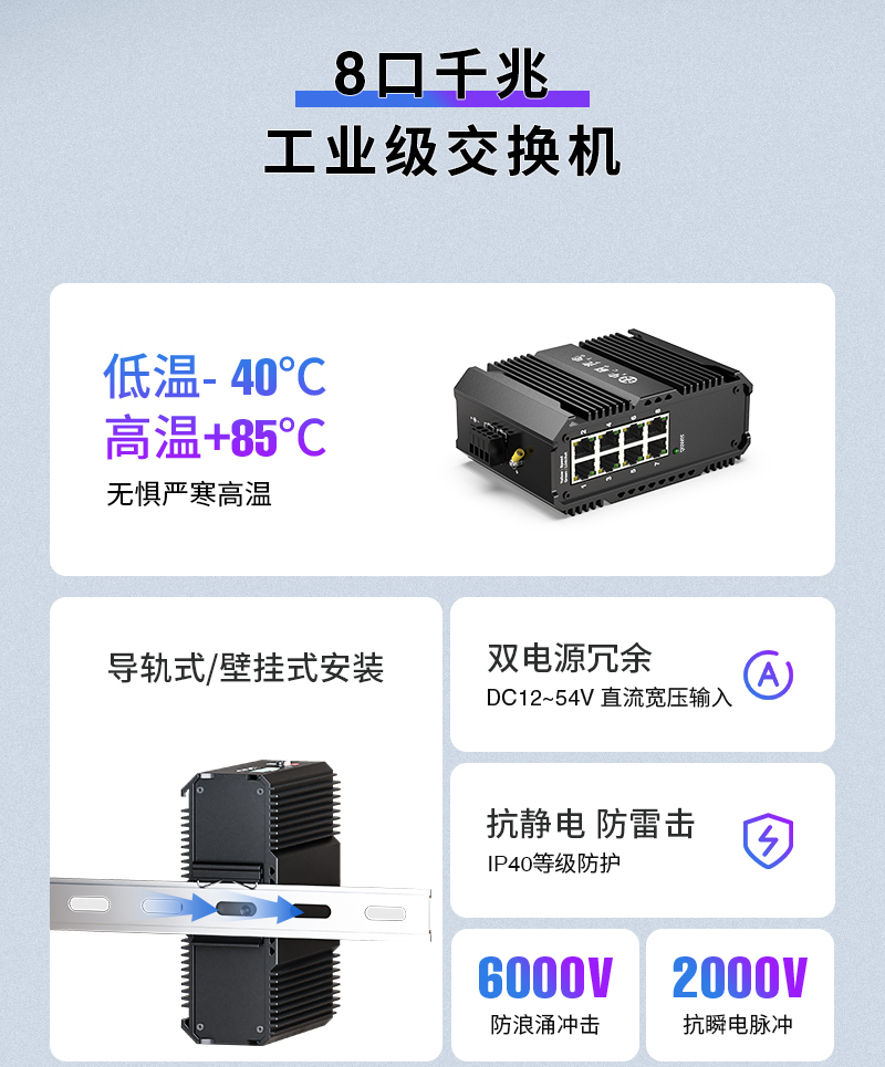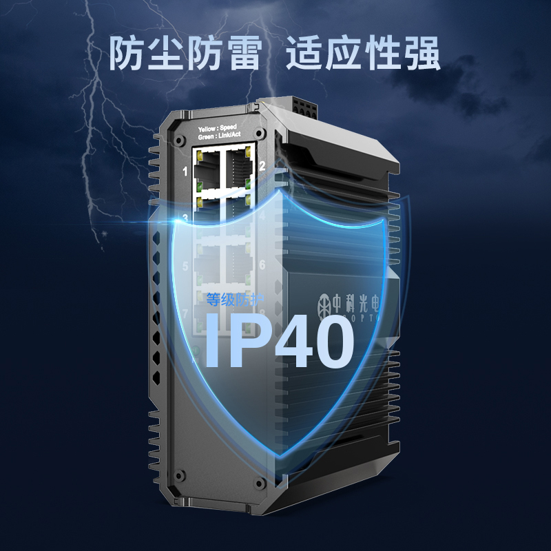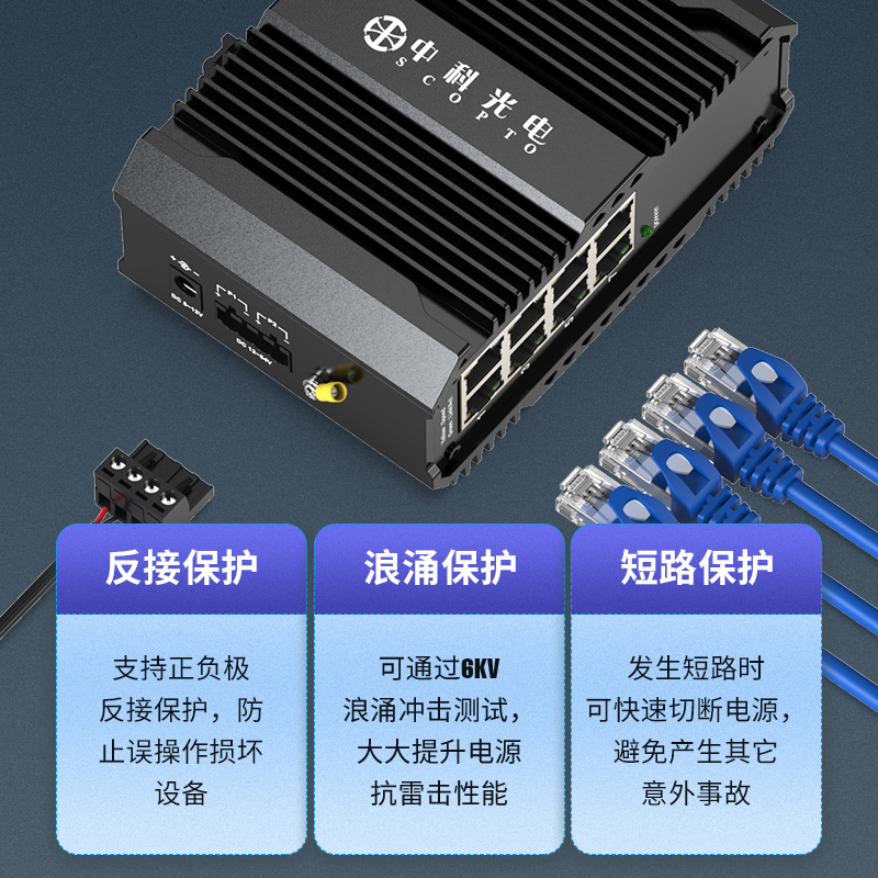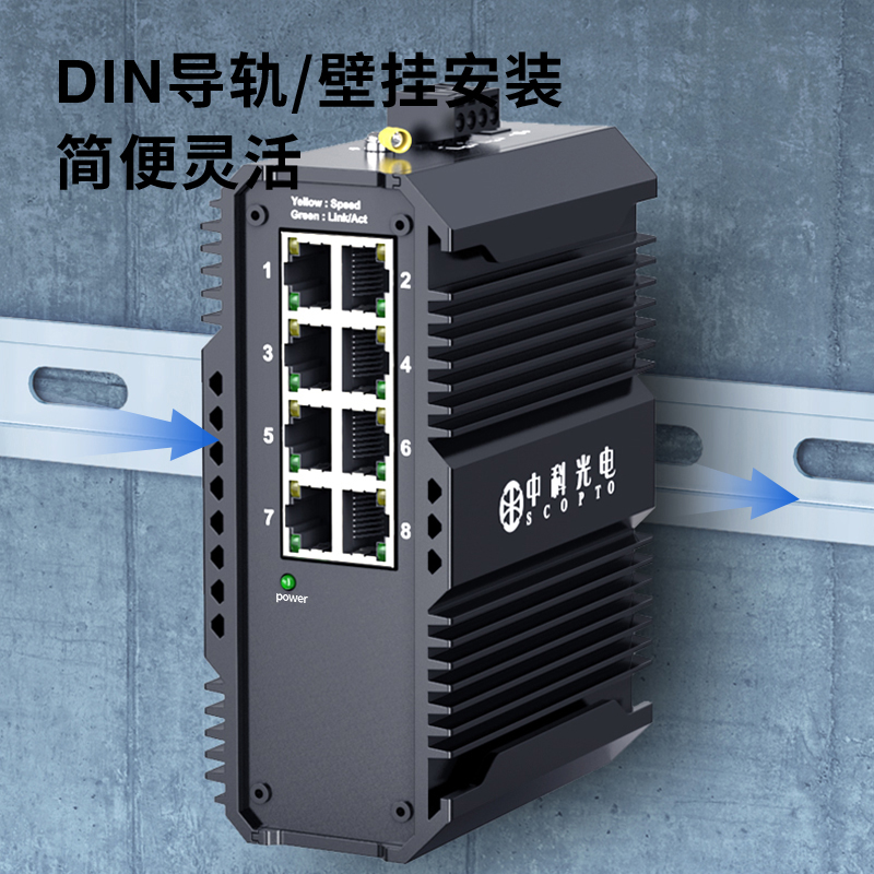 中科光電 工業(yè)級8口千兆交換機 安防監(jiān)控工業(yè)以太網(wǎng)交換機 12V/24V/48V供電導(dǎo)軌壁掛式安裝 ZK-7500-15-8GT