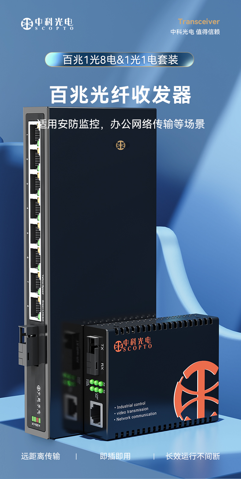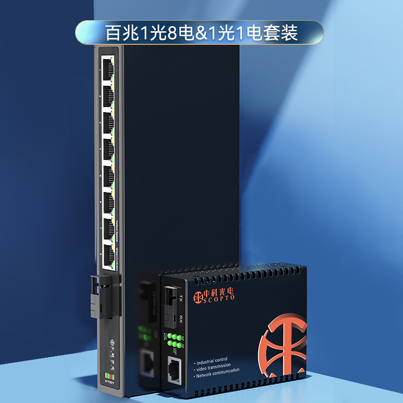 中科光電 百兆單模單纖光纖收發(fā)器 光電轉(zhuǎn)換器 1光8電+1光1電 單芯光纖轉(zhuǎn)網(wǎng)線ZK-FE/108-10A ZK-FE-10B一對