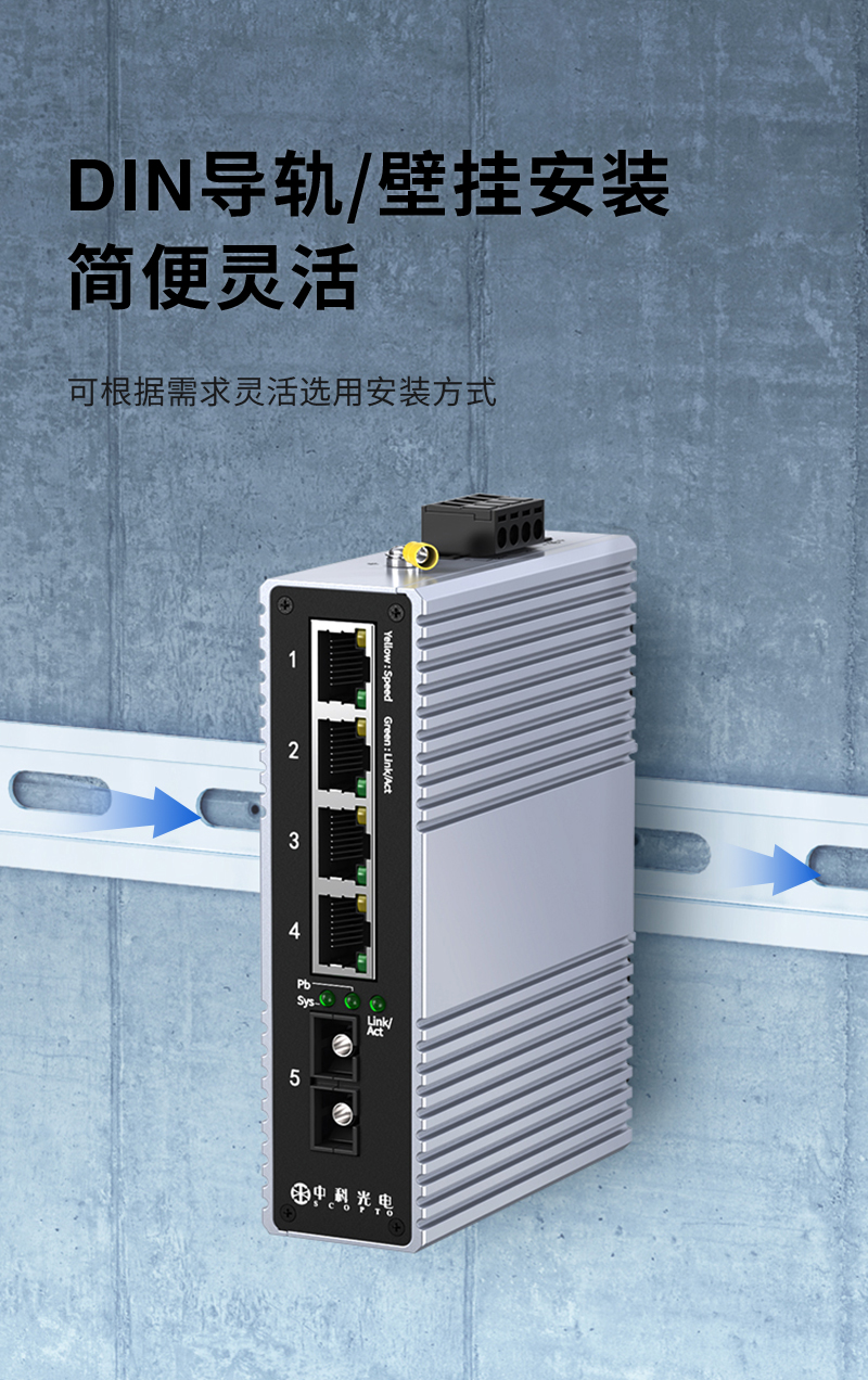 中科光電工業(yè)級光纖收發(fā)器千兆多模雙纖1光4電導(dǎo)軌式光電轉(zhuǎn)換器12V以太網(wǎng)交換機(jī)
