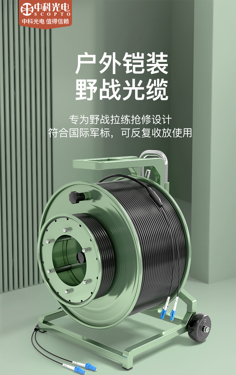 中科光電 單模雙芯室外TPU野戰(zhàn)光纜 鎧裝防水基站通信野外拉練搶修  1000/2000米+放纜車+LC接口