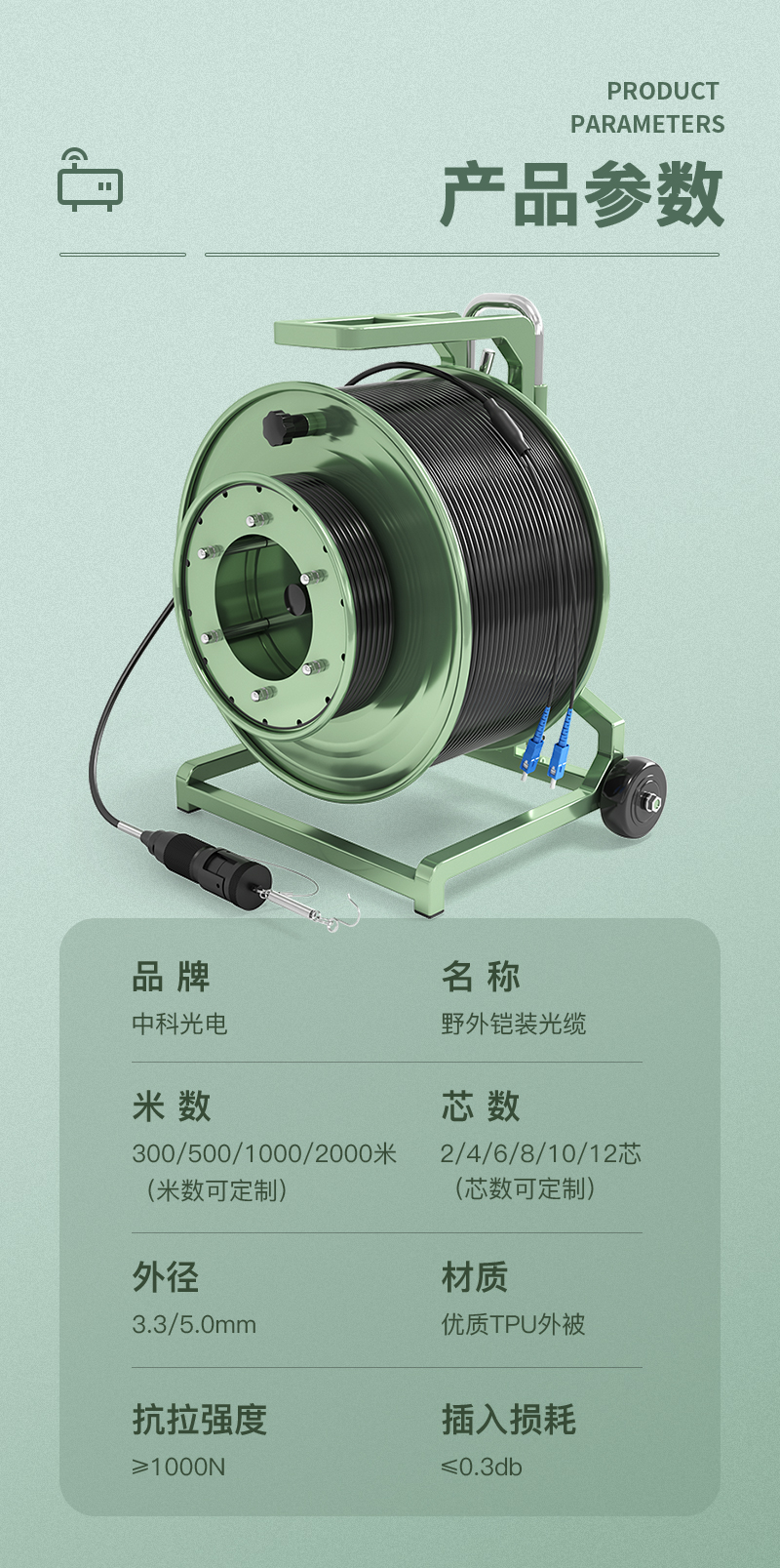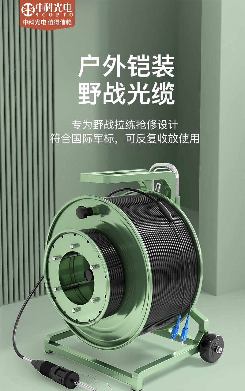 中科光電 單模雙芯車壁式TPU室外野戰(zhàn)光纜鎧裝防水通信野外拉練搶修1000/2000米+放纜車+航空頭-SC頭